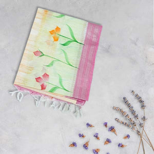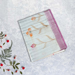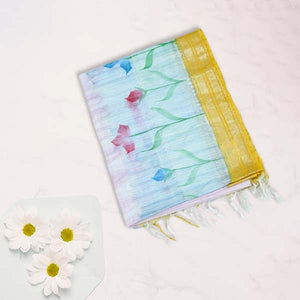 Elevate Your Style with this Exquisite Staple Silk Saree, Adorned with Intricate Zari Weaving and Elegant Hand-Painted Sarees. The Traditional Texture Border Adds a Classic Cultural Charm. Comes with a Matching Blouse Featuring the Same Graceful Border Design.
